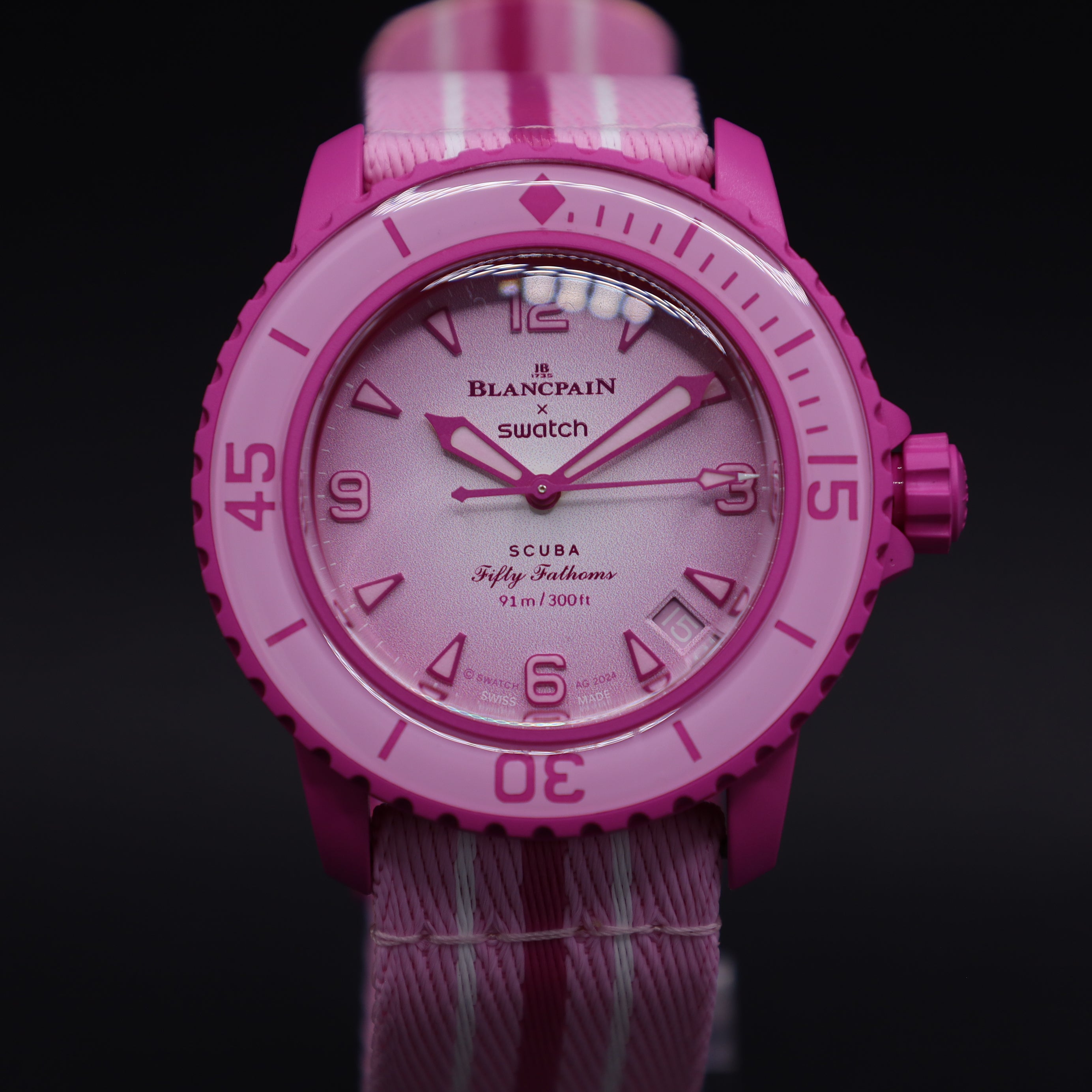 Diese Uhr ist inspiriert von legendären Taucheruhren und würdigt das Erbe maritimer Zeitmesser. Das rosafarbene Gehäuse besteht aus moderner Biokeramik. Auf der linken Seite ist ein markanter Schriftzug eingearbeitet. Das Zifferblatt im Farbverlauf zeigt das Datum zwischen der 4- und 5-Uhr-Position. Die mit Leuchtmasse ausgestatteten Indizes, Zeiger und die Minutenskala sorgen für beste Lesbarkeit im Dunkeln. Die Lünette ist einseitig drehbar und farblich auf das Gehäuse abgestimmt. Das Uhrenglas basiert auf biogenen Materialien.