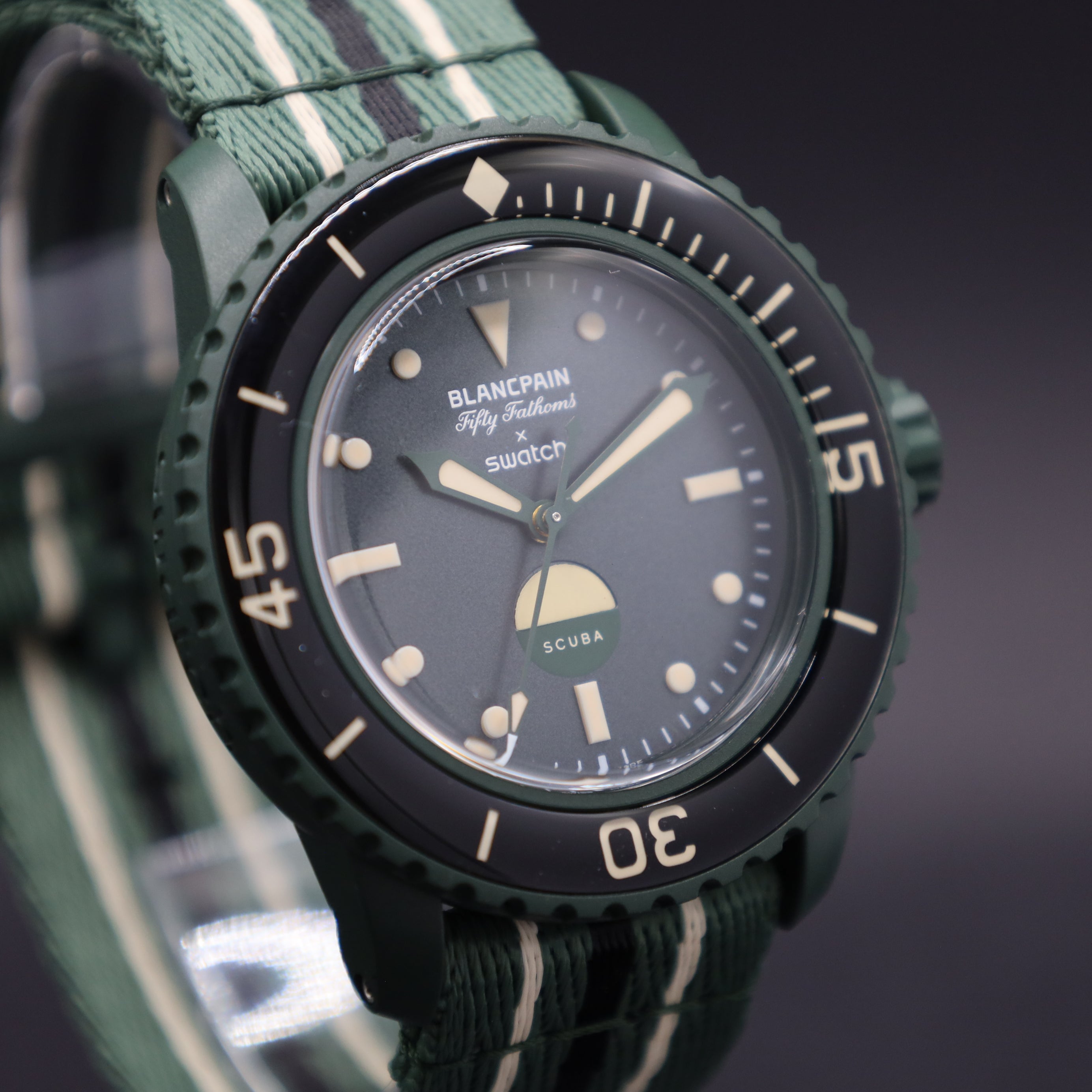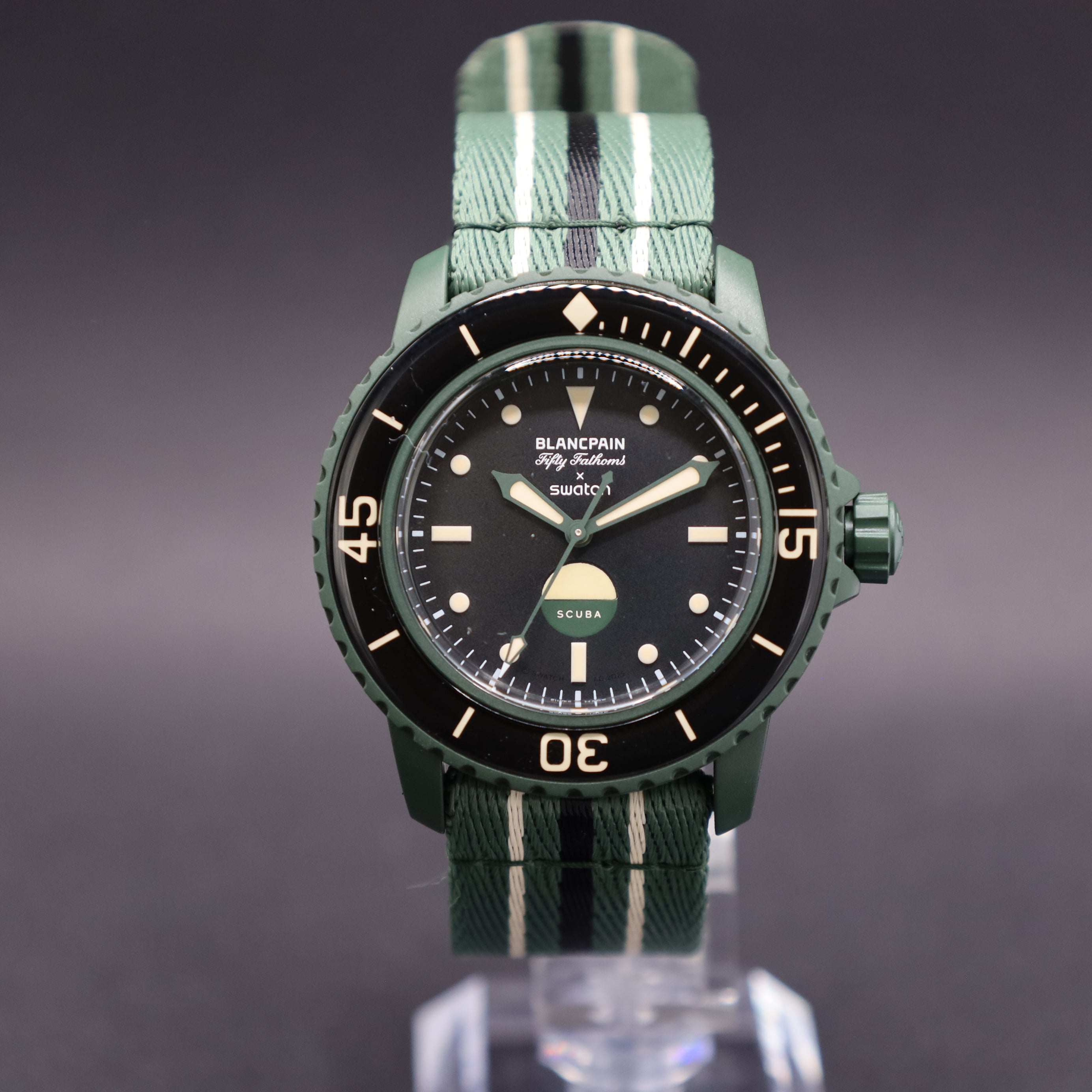 Die GREEN ABYSS SO35G100 vereint klassische Taucheruhrenästhetik mit moderner Technik und umweltfreundlichen Materialien. Als Teil der exklusiven Blancpain x Swatch Kollektion zollt dieses Modell der legendären Fifty Fathoms Tribut – einer Ikone unter den Taucheruhren.
