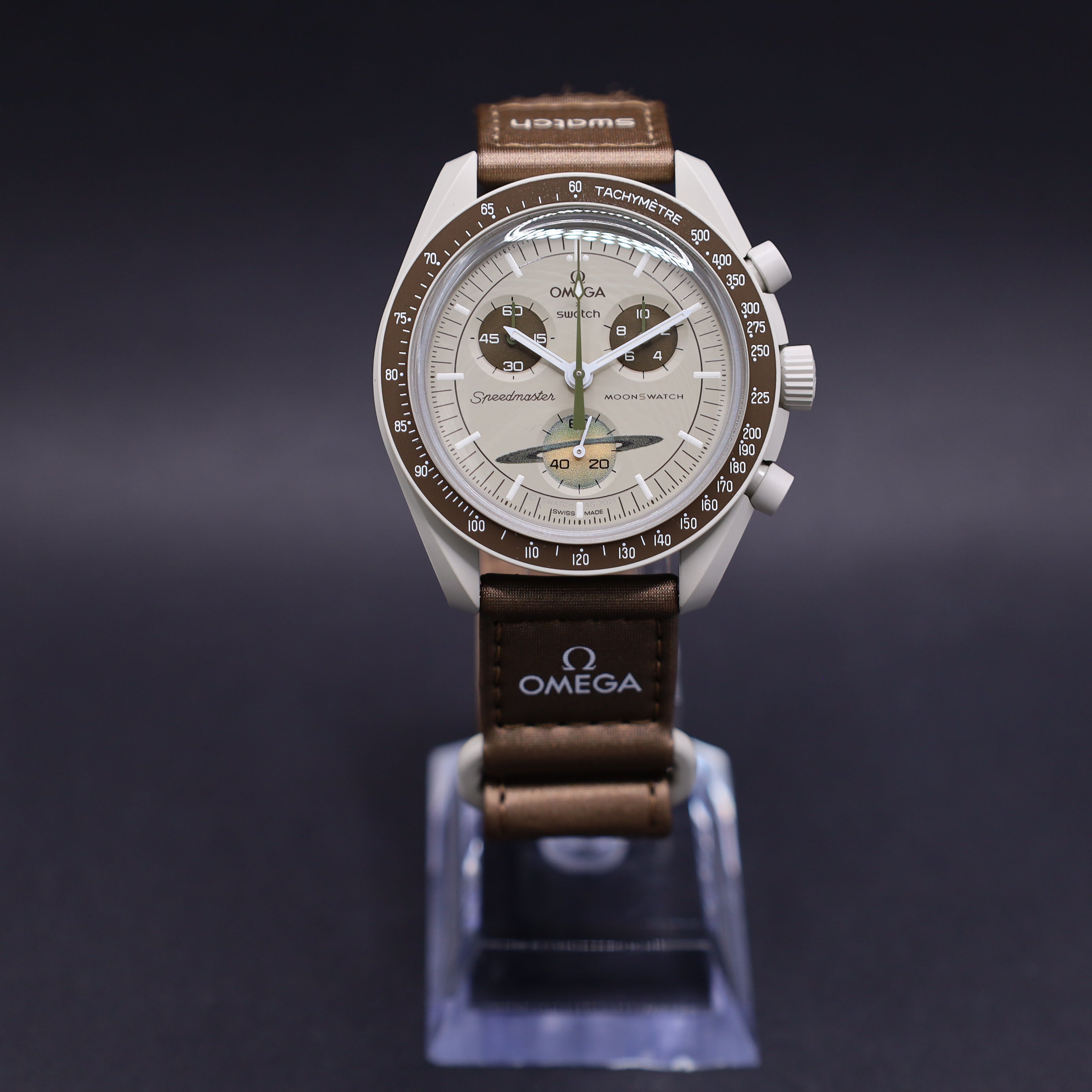 Dieses Modell beeindruckt mit sandig-kühlen Beigetönen, die einen wunderbaren Kontrast zum braunen Zifferblatt und dem VELCRO©-Armband schaffen. Der Sekundenzeiger des Chronographen, die Zeiger der Totalisatoren und die Tachymeterskala sind ebenfalls in einem ansprechenden Braun gehalten. Der Sekunden-Totalisator wird von den faszinierenden Saturn-Ringen umspielt. Die Zifferblätter sind stolz mit dem OMEGA X SWATCH Branding, dem legendären Speedmaster Logo sowie dem neuen MoonSwatch Logo versehen.