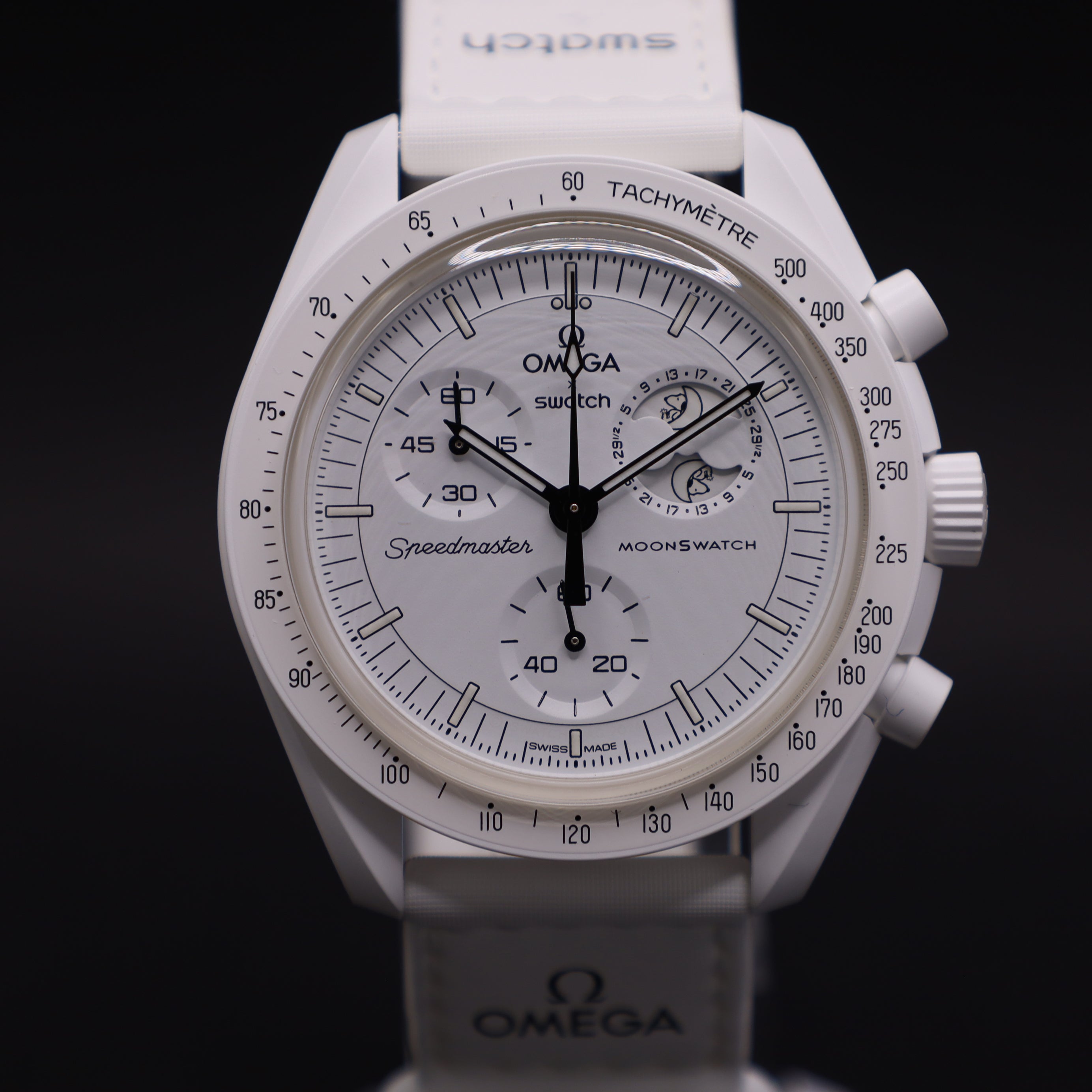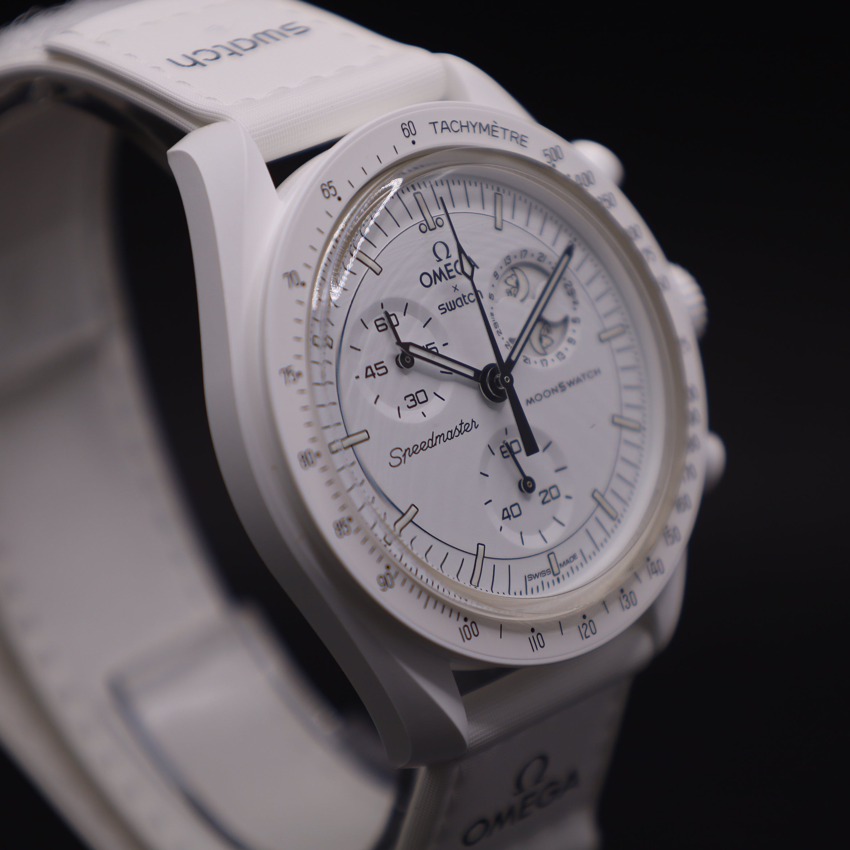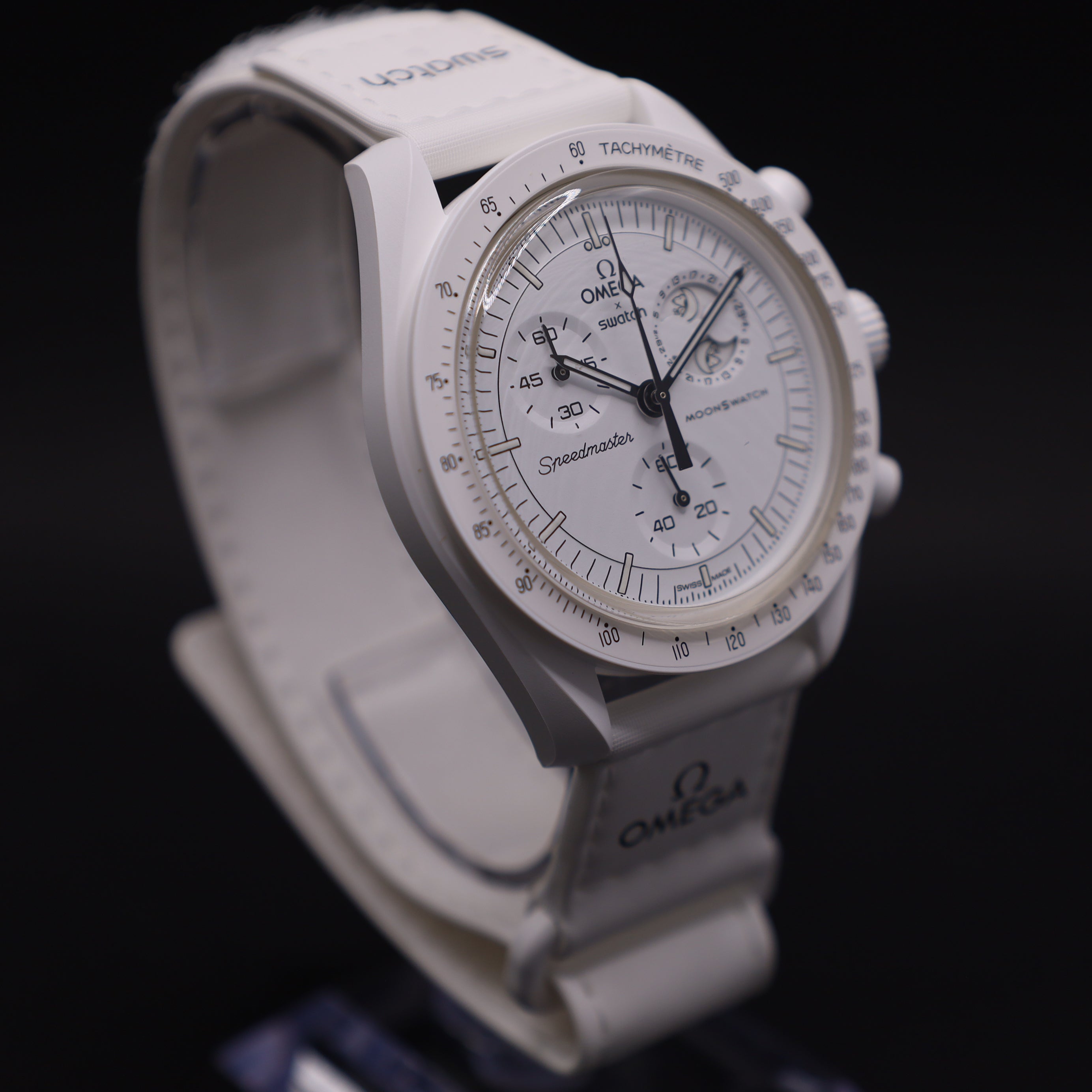 Das Zifferblatt trägt das OMEGA X Swatch Branding, das legendäre Speedmaster Logo und das MoonSwatch Logo. Zu den gemeinsamen Merkmalen aller Modelle gehören die gewölbte Konstruktion aus biobasiertem Glas mit einem eingeätzten „S“ in der Mitte, das elegante kreisförmige Muster auf dem äußeren Zifferblattring sowie die vertieften Hilfszifferblätter. Die Bandanstöße sind kantig und fließend gestaltet, und die Lünette aus Bioceramic weist den legendären „Punkt über der 90“ auf der Tachymeterskala auf. Nicht zu vergessen sind die einzigartige Optik und Haptik von Bioceramic.