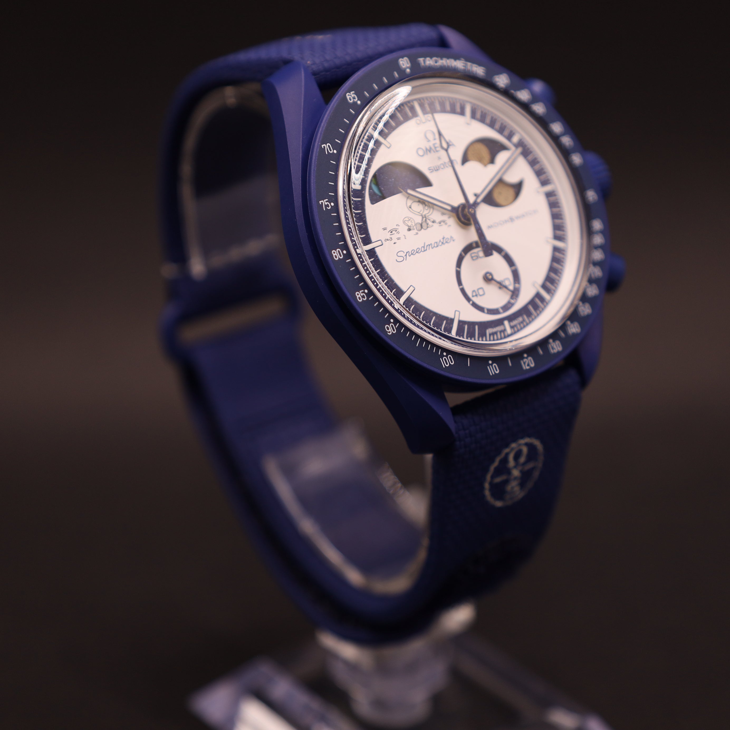 Bei 2 Uhr sitzt die Mondphasenanzeige mit zwei leuchtenden Vollmonden, beide veredelt mit Omega Moonshine Gold. Ein Mond ist im typischen Snoopy Stil gestaltet, der andere in einem Popcorn Design. Dieses verspielte Detail unterstreicht den humorvollen Charakter des Modells und verleiht der Uhr eine kreative Leichtigkeit.