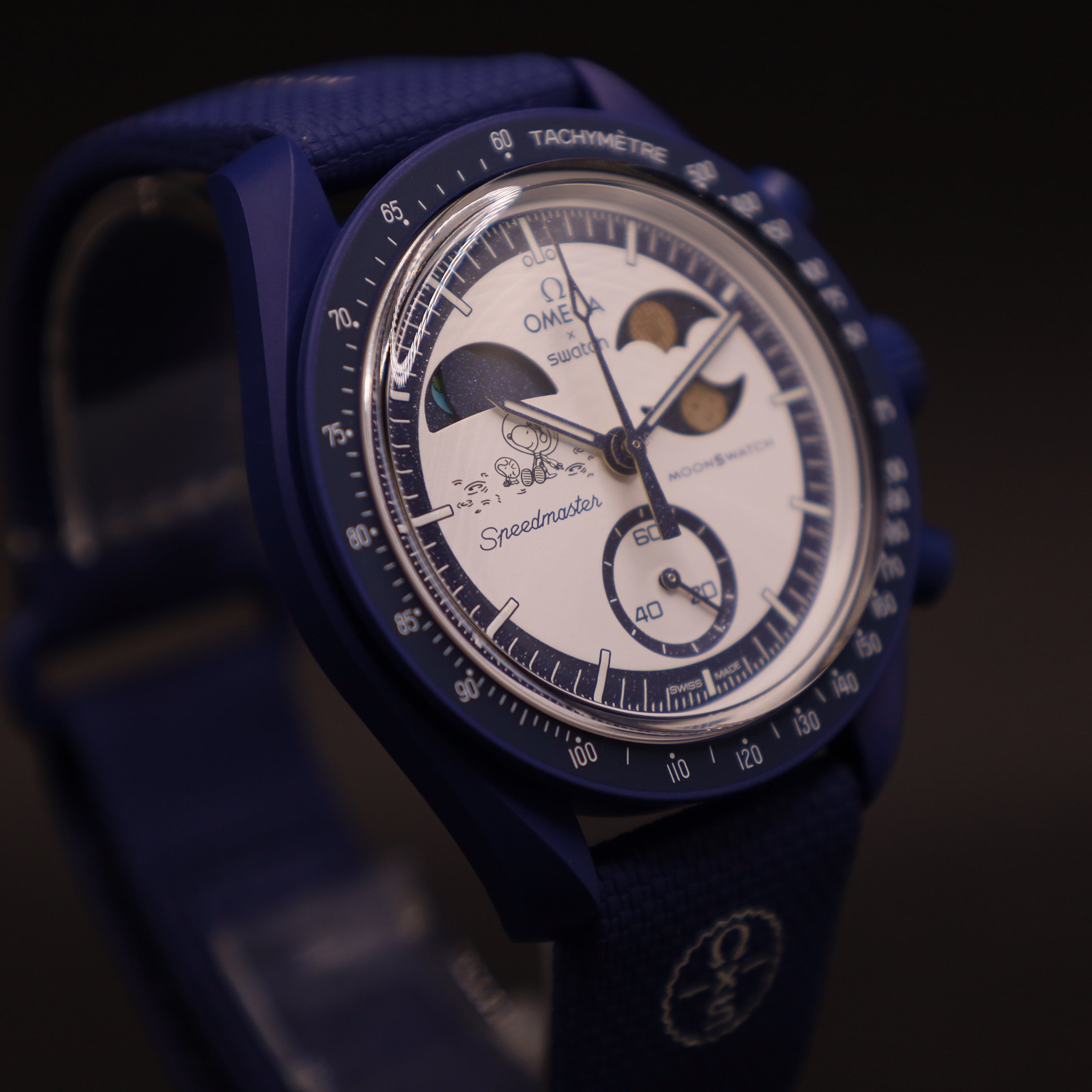Das weiß opaline Zifferblatt enthält zwei charakteristische Anzeigen. Bei 10 Uhr befindet sich die Erdphasenanzeige, begleitet von einer liebevoll gestalteten Illustration von Snoopy und Woodstock. Die beiden Figuren erscheinen als kleine Astronauten, die von der Mondoberfläche aus die Erde betrachten. Unter UV Licht zeigt sich zudem ein versteckter Schriftzug, der dem Motiv zusätzliche Tiefe verleiht.